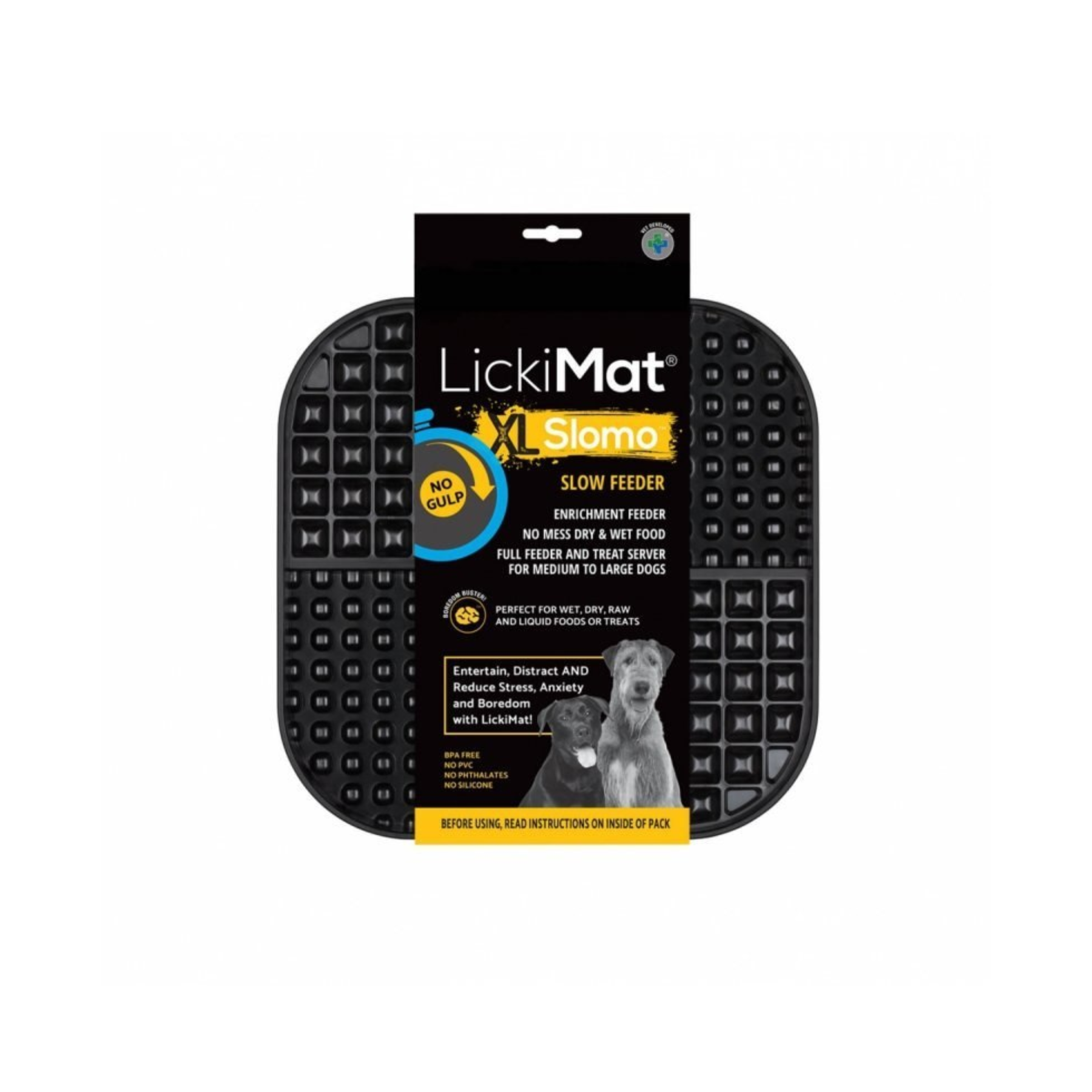 Mata do lizania dla dużych i średnich psów LickiMat Slomo XL. W znacznym stopniu uatrakcyjni wydawanie posiłków zarówno w stałej, miękkiej jak i płynnej postaci. Długie lizanie uwolni hormony odpowiedzialne za dobre samopoczucie i pomoże w wyciszeniu Twojego Czworonoga.
